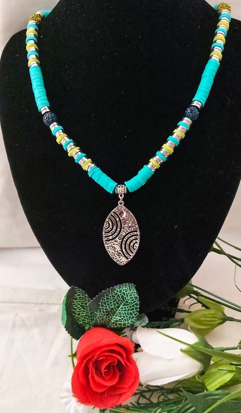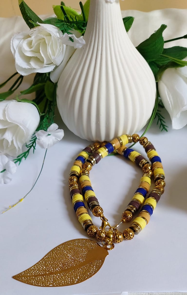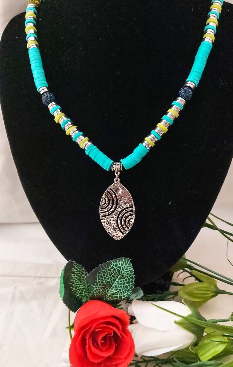 Heishi rhinestone with silver leaf pendant